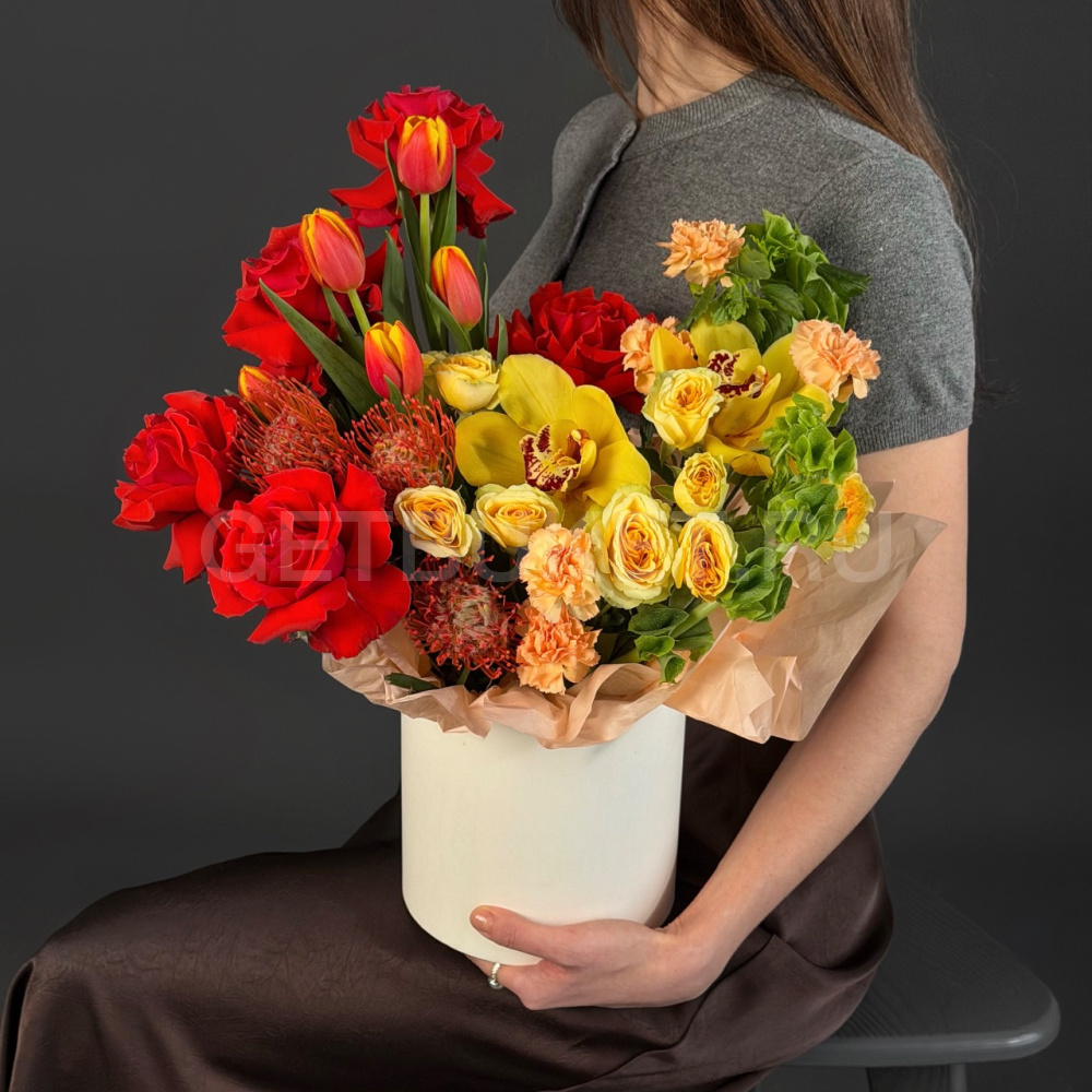 Цветочная композиция из красных роз, молюцеллы и протеи в шляпной коробке12 450 ₽Цветочная композиция из красных роз, молюцеллы и протеи в шляпной коробке 12 450 ₽ -