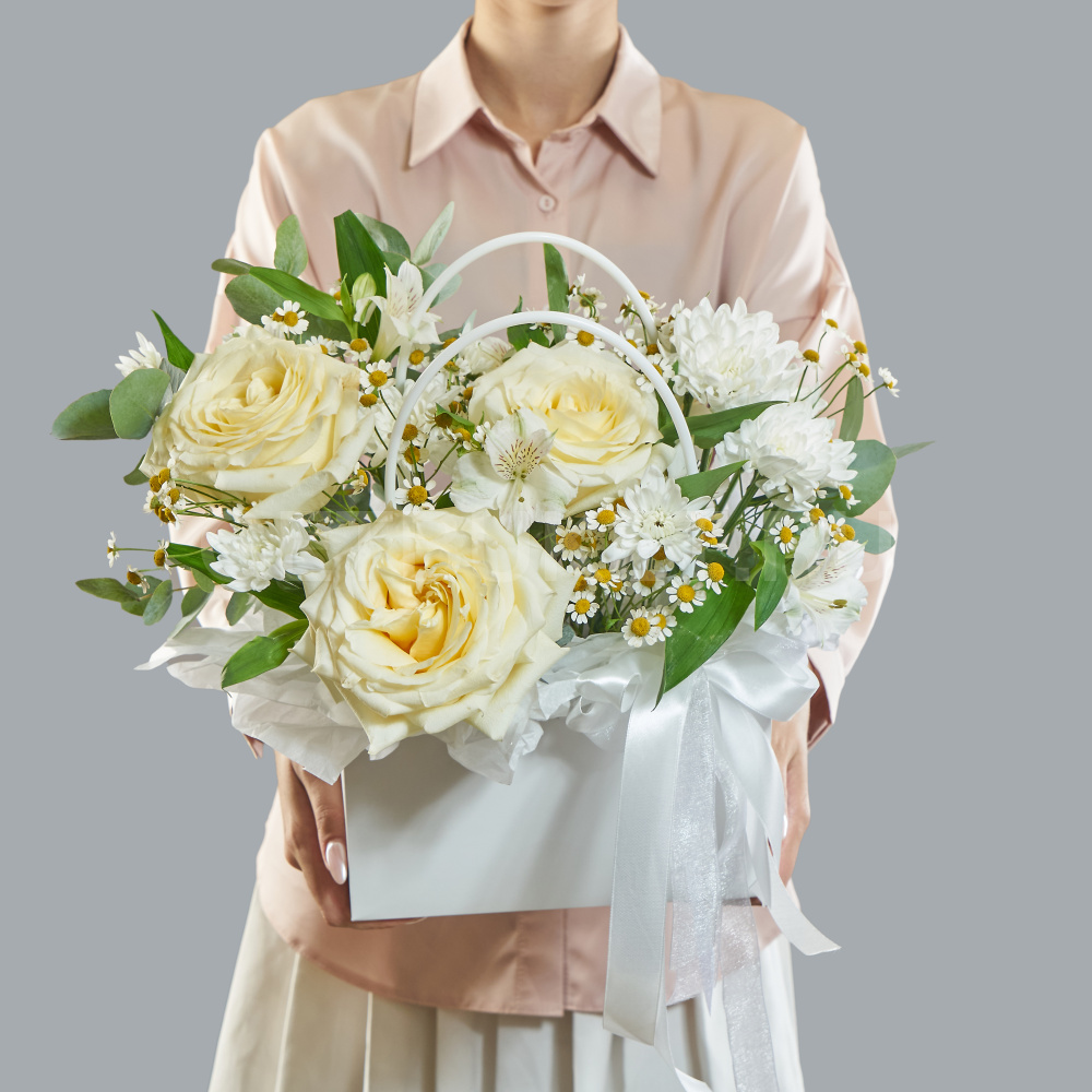 Цветочная композиция из роз с хризантемой и эустомой в сумочке4 190 ₽Цветочная композиция из роз с хризантемой и эустомой в сумочке 4 190 ₽