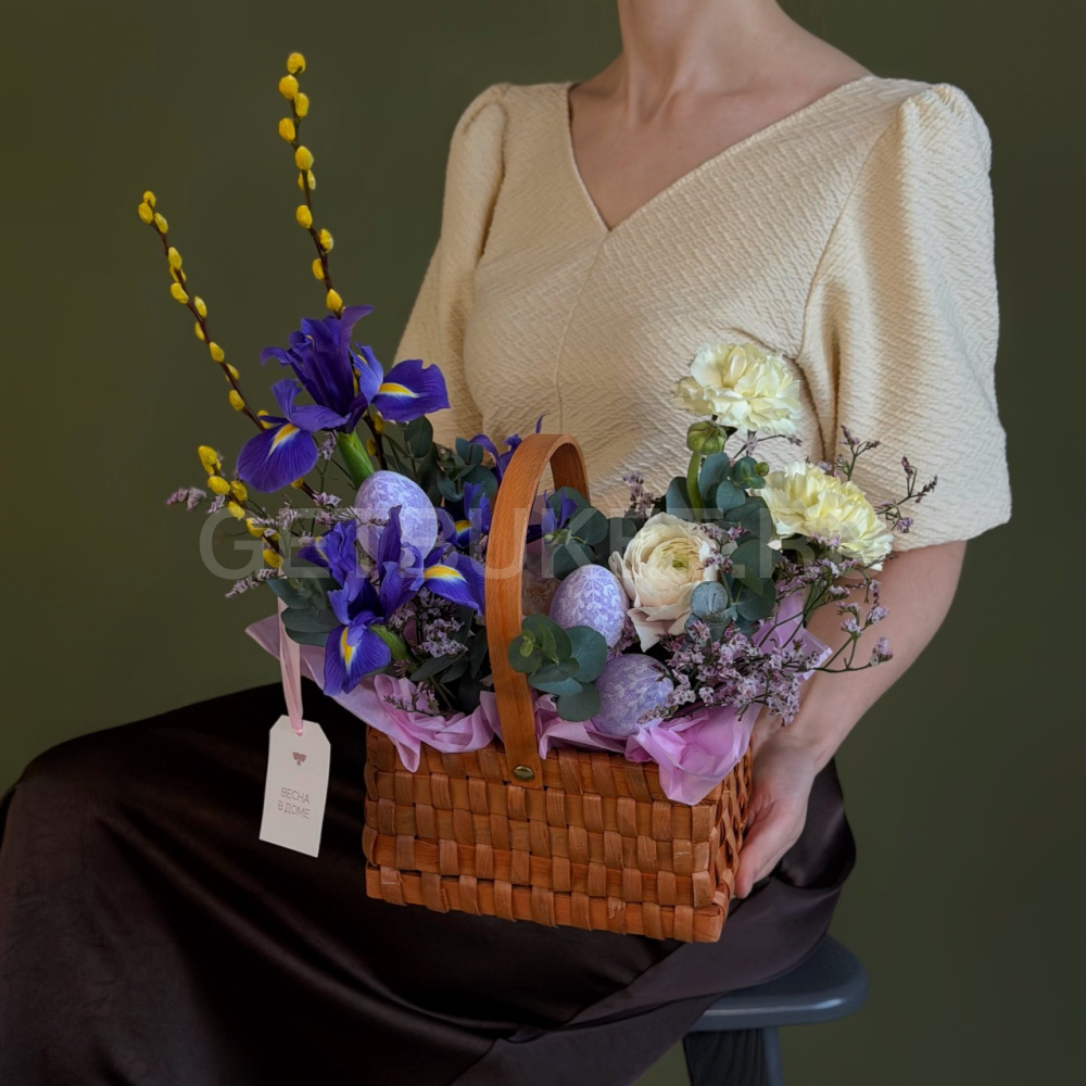 Цветочная композиция из ирисов, вербы и гвоздики в плетеной корзине